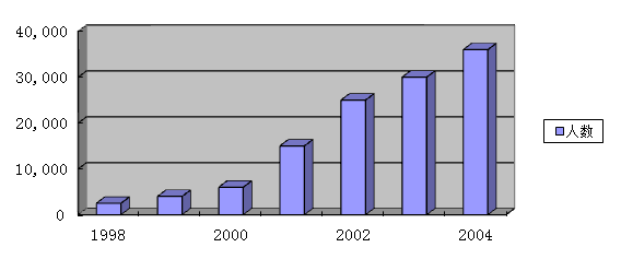 The diagram above clearly illustrates that dramatic elevation has occurred in the recruitment of Master of Engineering (ME) in the past seven years. According to the statistics given above, we may conclude that the recruitment of ME was on a steady rise from 1998 to 2004. In 1998, the number was at a low level, only about 2,500. Surprisingly, it reached to more than 35,000 in 2004 within no more than seven years.
