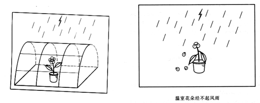 The set of drawings above vividly depict the destiny of a flower in different circumstances. As is shown in the first cartoon, the flower is growing in full bloom in a comfortable greenhouse that shelters it from the threatening lightning and storm. On the contrary, when removed from the greenhouse and exposed to the driving rain, the flower soon fades and withers.
