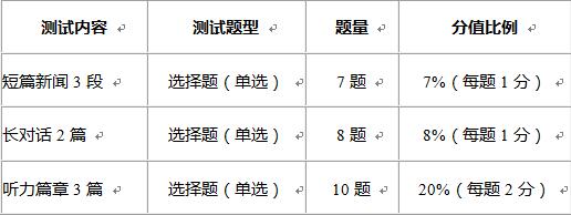 1. 取消短對話,2. 取消短文聽寫,3. 新增短篇新聞(3段)。其余測試內(nèi)容不變。調(diào)整后四級聽力部分的試題結構見下表:
