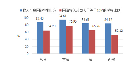 圖3 2016年東中西部地區(qū)接入互聯(lián)網(wǎng)的中小學(xué)比例情況