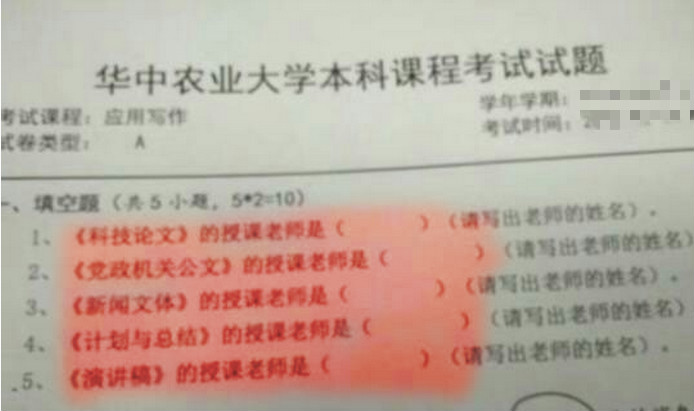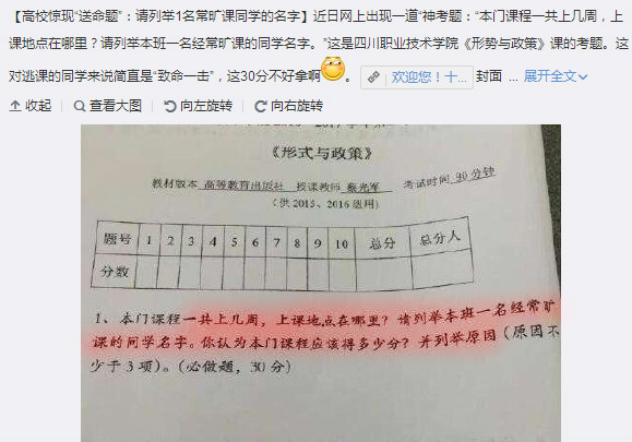 與四川職業(yè)技術(shù)學(xué)院考題相比,樓上兩位簡(jiǎn)直小巫見大巫,看這奪命連環(huán)問,“上幾周課,在哪上,誰沒來,你得多少分,你憑啥?”,小編隱約感覺到老師“眉眼含笑”地說,“小樣,敢不來上課,看你怎麼考?”