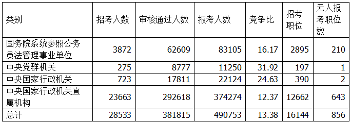 國稅是招錄大戶,目前共有19萬人通過審核,共有24萬人報(bào)名,競爭比為11:1,仍有367個(gè)職位無人報(bào)考。鐵路公安審核通過人數(shù)位居第二,目前有2.5萬人通過審核,競爭比為16:1。值得關(guān)注的是,國家物資儲(chǔ)備局雖然招錄人數(shù)不是很高,僅有51人,但目前有4236人報(bào)名,3554人通過審核,競爭比高達(dá)70:1。