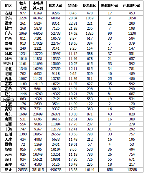 從各地報(bào)名情況來看,北京、廣東、湖北、山東、四川、貴州、浙江等省份為較熱的地區(qū),報(bào)名人數(shù)較多,與這些地區(qū)招錄人數(shù)多有很大關(guān)系。從競爭比來看,福建目前競爭比最高,招錄261人,有8351人通過審核,競爭比為22.3:1,其次為甘肅,北京排第三位。