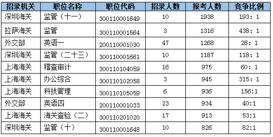 從表1可以發(fā)現(xiàn),海關(guān)包攬了10大崗位中的8個(gè),但是如此大的競爭比也讓不少考生望而生畏。