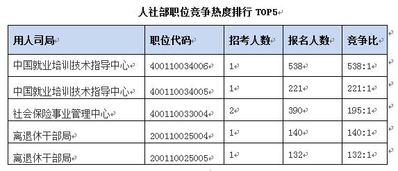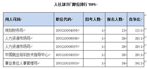國(guó)考報(bào)名第八天,距報(bào)名結(jié)束隻有兩天了,根據(jù)歷年國(guó)考十天的報(bào)名情況得出國(guó)考報(bào)名第八天是集中填報(bào)的高峰期,之后會(huì)出現(xiàn)下降趨勢(shì)。人社部競(jìng)爭(zhēng)最激烈的職位依然是中國(guó)就業(yè)培訓(xùn)技術(shù)指導(dǎo)中心質(zhì)量督導(dǎo)辦公室主任科員及以下職位,職位代碼400110034006,這一職位勢(shì)必會(huì)一直佔(zhàn)據(jù)人社部最熱職位榜首。我們?cè)趫?bào)名時(shí)要避熱就冷,下面我們來(lái)看一下,人社部最冷的職位有哪些?