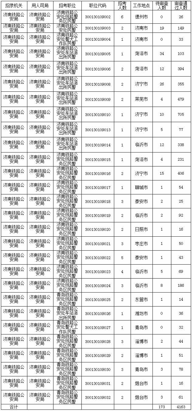 與前兩次統(tǒng)計時間相同,工作地點在濟寧市的濟南鐵路公安處車站派出所民警,崗位代碼300130109010仍是競爭最激烈的崗位,競爭比例已經(jīng)達到了705:1,目前競爭低於10:1的崗位有300130109002、300130109018、300130109020、300130109022、300130109025、300130109031。