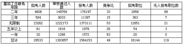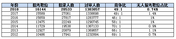再次從無人報(bào)考職位來看,共有119個(gè)職位無人報(bào)考,佔(zhàn)0.74%,比去年降低了一半。而從近7年的數(shù)據(jù)來看,除了2012年為0.7%,其余年份都比今年高,也可以看出考生報(bào)名更加向著均衡化發(fā)展。