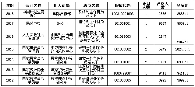 最后從最熱職位競爭比來看,目前依然是中國計(jì)劃生育協(xié)會國際合作部聯(lián)絡(luò)處主任科員及以下(職位代碼100310004003)一職競爭比最高,為2666:1,相對於近7年其他職位的數(shù)據(jù)而言,柔和了很多,已經(jīng)不再是萬裡挑一的局面了。
