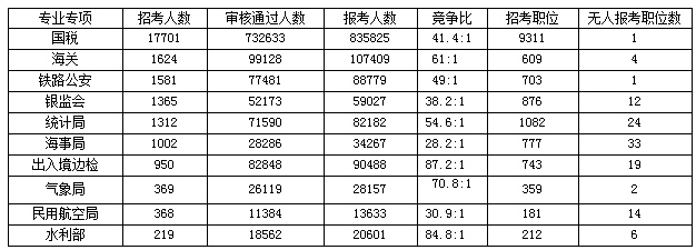 國稅是招錄大戶,共有73萬人通過審核,仍有10萬人待審中,無人報(bào)考職位僅剩1個(gè)。海關(guān)審核通過人數(shù)位居第二,有9.9萬人通過審核,競爭比為61:1。水利部競爭比最高,為85:1。國稅、海關(guān)、鐵路公安、銀監(jiān)會、統(tǒng)計(jì)局、海事局、出入境邊檢、氣象局、民航、水利部是國考招錄大戶,也是考生報(bào)考的重點(diǎn),競爭壓力都不小