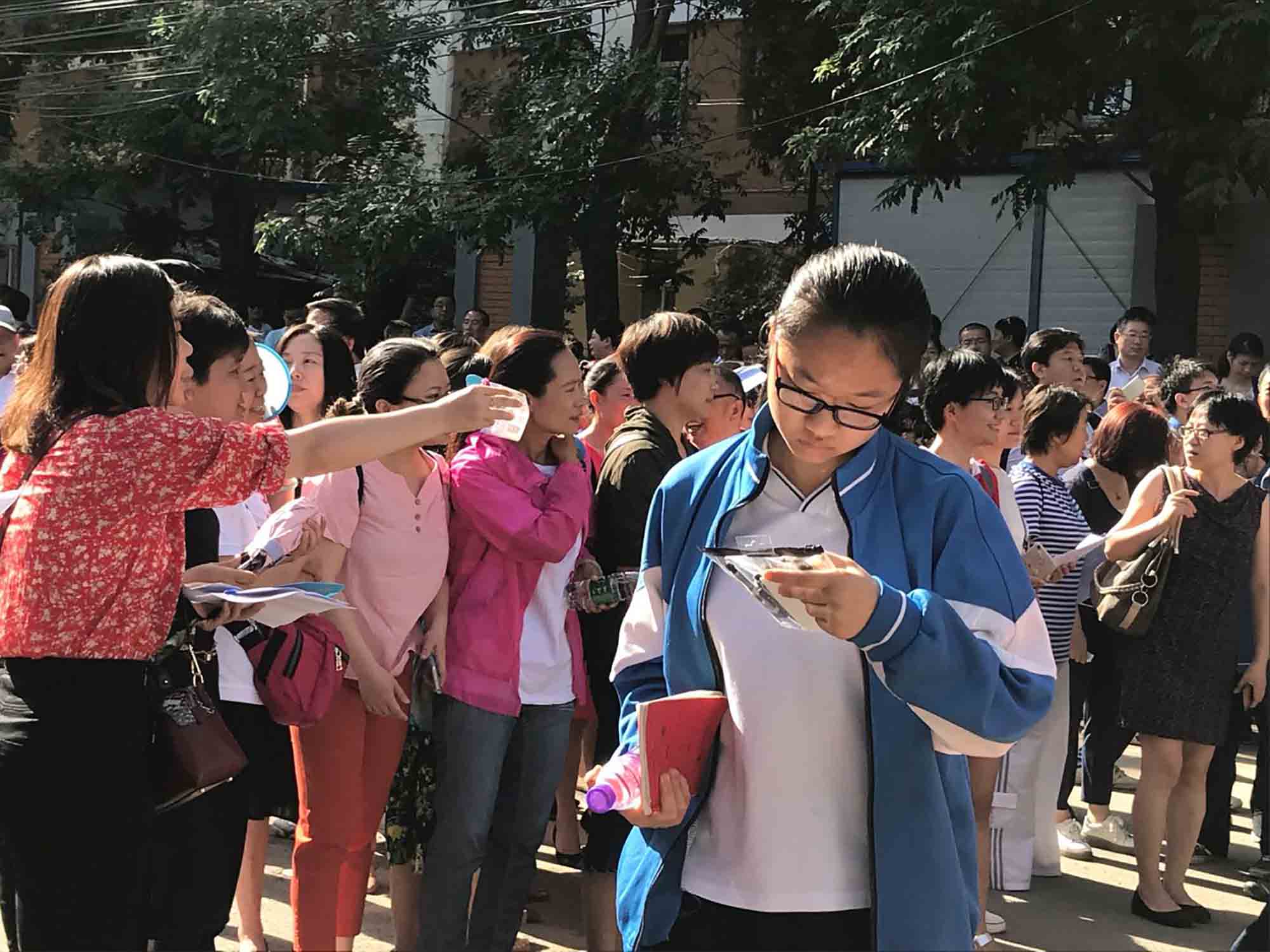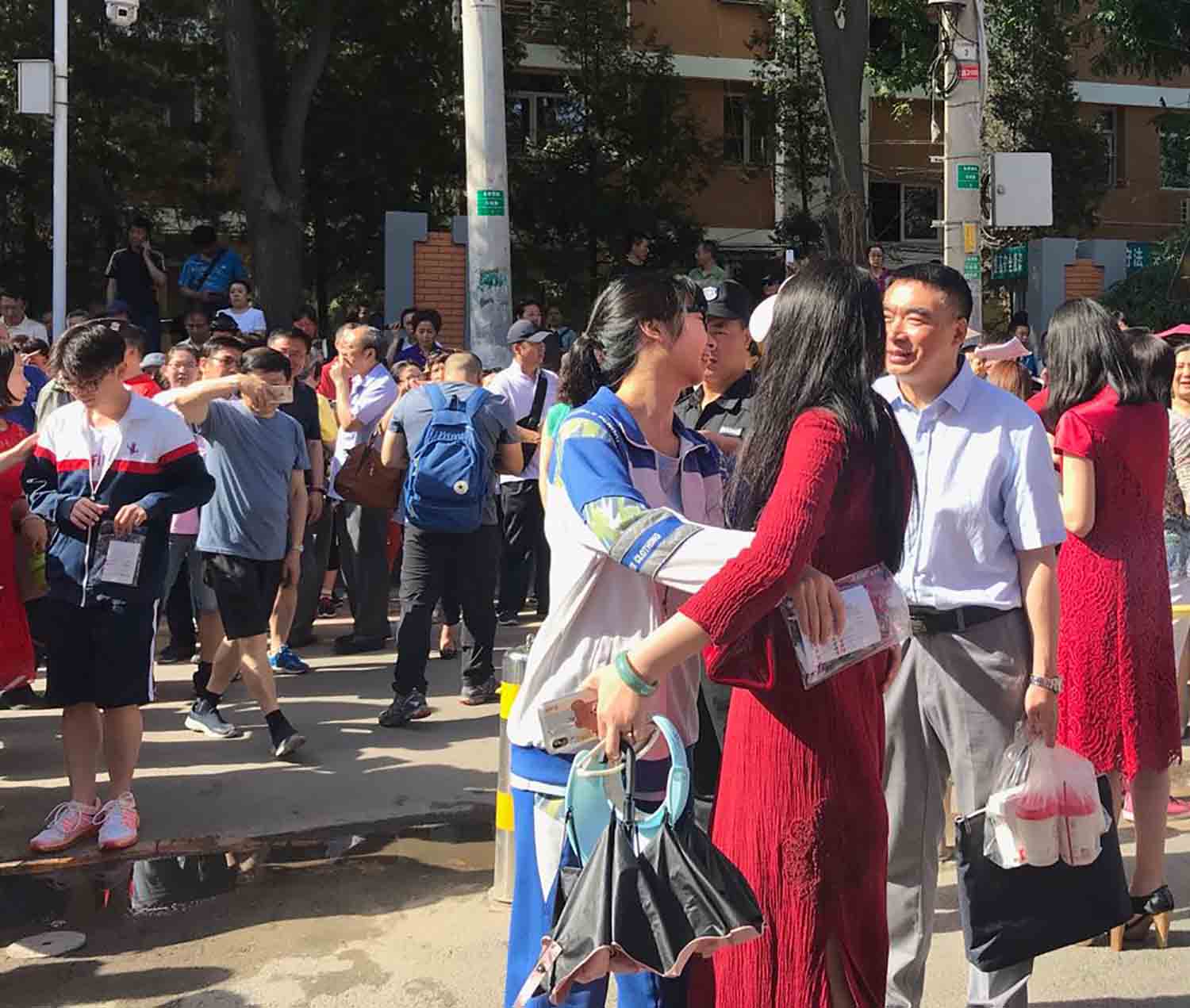 根據(jù)氣象局天氣預(yù)報顯示,今明兩天北京氣溫在20-33°之間,天公作美,高考這兩天的天氣較前兩日涼快了許多,家長帶著考生聚集在陰涼地方,有臨陣磨槍的,有相互鼓舞的,也有為開考前嘮嗑解壓的……還有一些家長和考生們則選擇了遠(yuǎn)離人群,在稍遠(yuǎn)一些的地方一家人在那裡安靜的站著,等待入場。