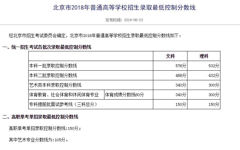 人民網(wǎng)北京6月23日電 (記者 熊旭)今天,北京市教委召開新聞發(fā)布會(huì),公布2018年北京市普通高校招生錄取相關(guān)情況,相關(guān)負(fù)責(zé)人表示,截至目前,報(bào)名、考試、評(píng)卷核分等工作環(huán)節(jié)的任務(wù)已順利完成,北京本科一批錄取控制分?jǐn)?shù)線:文科576分,理科532分﹔本科二批錄取控制分?jǐn)?shù)線:文科488分,理科432分。今天12時(shí)發(fā)布考生高考成績,統(tǒng)考考生的本科志願(yuàn)填報(bào)和單考考生單招志願(yuàn)填報(bào)工作將於6月25日至29日進(jìn)行,錄取工作將於7月6日至8月3日進(jìn)行。