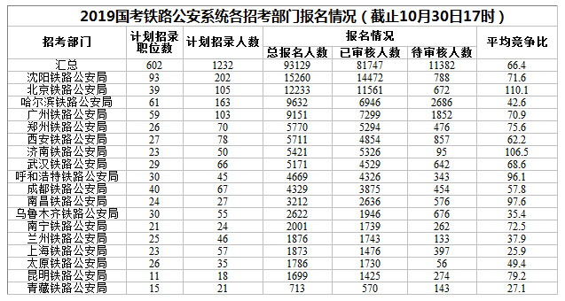 2019國考鐵路公安系統(tǒng)各招考部門報名情況(截止10月30日17時) 圖片來源:華圖教育