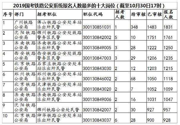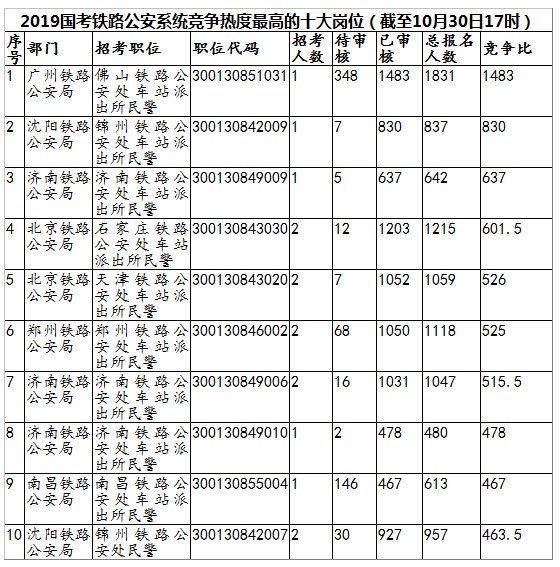 2019國考鐵路公安系統(tǒng)競爭熱度最高的十大崗位(截止10月30日17時) 圖片來源:華圖教育