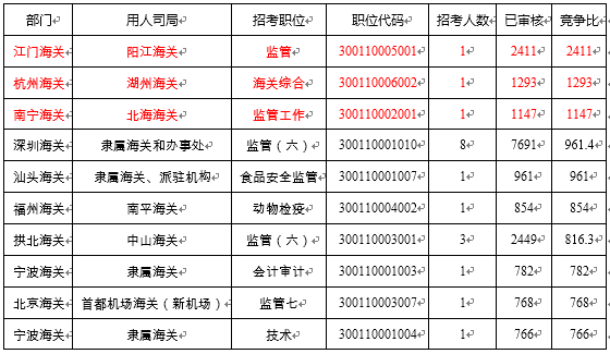 截止31日18:00,海關(guān)系統(tǒng)競(jìng)爭(zhēng)最激烈的十大崗位如下表所示。江門(mén)海關(guān)轄下陽(yáng)江海關(guān)職位代碼為300110005001的崗位連續(xù)多日成為海關(guān)競(jìng)爭(zhēng)最激烈崗位。該崗位因其報(bào)名限制少,專(zhuān)業(yè)覆蓋面廣成為今年海關(guān)競(jìng)爭(zhēng)之冠。但是該崗位僅招錄1人,已經(jīng)通過(guò)審核2411。而競(jìng)爭(zhēng)最激烈的十大崗位,競(jìng)爭(zhēng)比均已破七百大關(guān),3個(gè)職位競(jìng)爭(zhēng)比破一千。