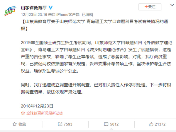 山東省教育廳官方微博發(fā)布消息回應(yīng)稱,2019年全國碩士研究生招生考試期間,山東師范大學(xué)自命題科目《外語教學(xué)理論基礎(chǔ)》、青島理工大學(xué)自命題科目《城鄉(xiāng)規(guī)劃理論綜合》發(fā)生了試題錯裝,這是嚴(yán)重的責(zé)任事故,影響了考生正??荚?,造成了惡劣影響。