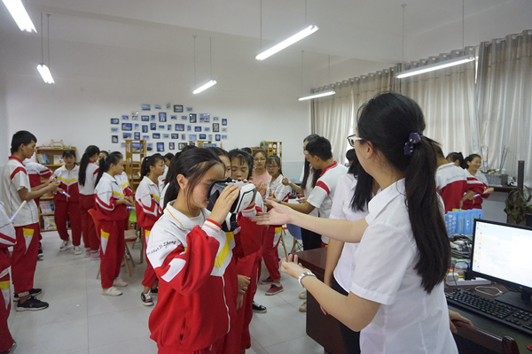 資料圖:研支團(tuán)成員帶領(lǐng)同學(xué)們體驗(yàn)最新科技產(chǎn)品