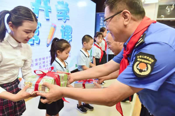 北京市東城區(qū)城管局的校外輔導(dǎo)員向?qū)W生們贈送普法書籍 圖/學(xué)校供圖