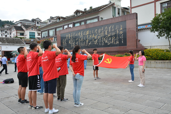資料圖:廈門大學(xué)“凝心聚力,心動(dòng)空天”暑期社會(huì)實(shí)踐隊(duì)在遵義會(huì)議會(huì)址前重溫入黨誓詞(學(xué)校供圖)