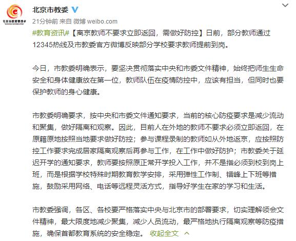 北京市教委明確要求,按中央和市委文件通知要求,當前的核心防疫要求是減少流動和聚集,做好隔離和觀察。因此,目前人在外地的教師不要求必須立即返回,在原籍原地按照當?shù)匾笞龊梅揽丞r參與課程錄制的教師如從外地返京,應(yīng)按照防控工作要求完成居家隔離觀察后再參與工作,在工作中做好防護﹔市教委關(guān)於延遲開學(xué)的通知要求,教師要按照原正常開學(xué)投入工作,並不是指必須到校到崗上班,而是根據(jù)學(xué)校特殊時期教育教學(xué)安排,採用彈性工作制、錯峰上下班等措施,鼓勵採用網(wǎng)絡(luò)、電話等遠程靈活方式,指導(dǎo)好學(xué)生在家的學(xué)習(xí)和生活。