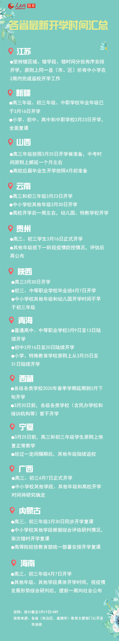基於此,全國(guó)多地近日陸續(xù)明確開學(xué)時(shí)間、部署錯(cuò)峰開學(xué)等,逐漸恢復(fù)正常的教學(xué)秩序。人民網(wǎng)教育頻道集中匯總目前各地最新開學(xué)時(shí)間安排,以供參考。