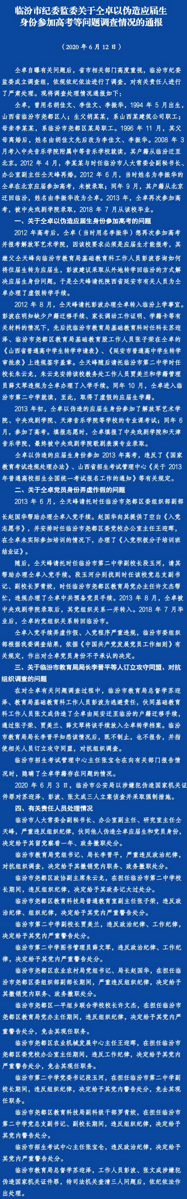 人民網(wǎng)北京6月12日電 (記者 郝孟佳)今天,山西省紀委監(jiān)委網(wǎng)站發(fā)布了關於仝卓以偽造應屆生身份參加高考等問題調(diào)查情況的通報,其繼父仝天峰因偽造仝卓應屆生和黨員身份,被給予留黨察看一年、政務撤職處分。臨汾市教育局黨組書記、局長李晉平對抗組織調(diào)查,被撤銷黨政職務。此外,臨汾市教育局總督學蘇迎澤,工作人員彭波、張文成涉嫌犯偽造國家機關証件罪,待司法機關查清三人問題后,依紀依法作出處理。