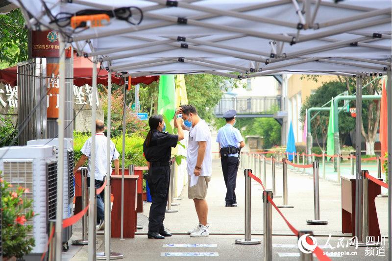 7月7日,成都市第十二中學(xué)考點,考生在進(jìn)入考場前測量體溫。朱虹/攝