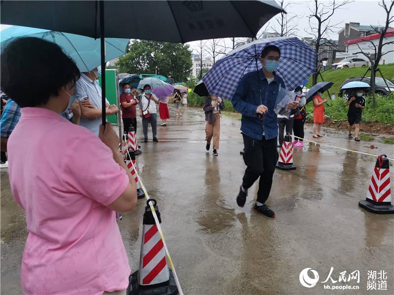華中科技大學(xué)附屬中學(xué)外,老師和家長送學(xué)子進(jìn)考場。周雯/攝