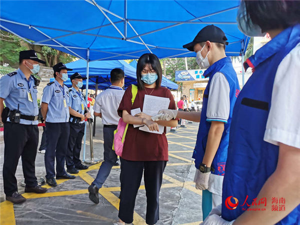 7月7日,海南中學(xué)考點,考生在考場入口接受測溫。王碩/攝