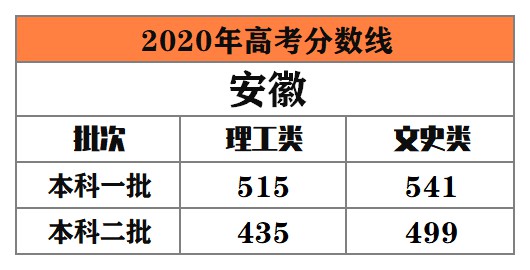 安徽 本科一批:理工類515分。文史類541分﹔本科二批:理工類435分,文史類499分。