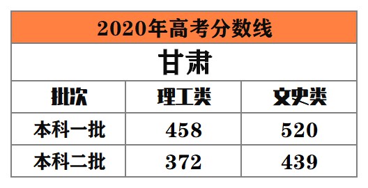 甘肅 本科一批:理工類458分,文史類520分﹔本科二批:理工類372分,文史類439分。