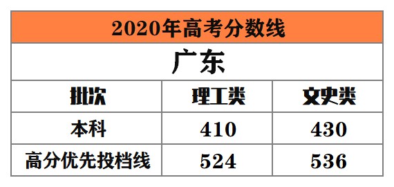 廣東 本科最低控制線:理工類410分﹔文史類430分﹔高分優(yōu)先投檔線:理工類524分,文史類536分。