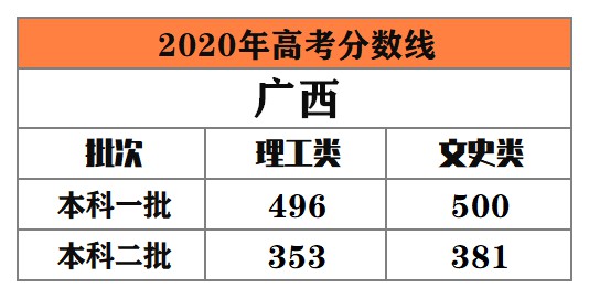 廣西 本科一批:理工類496分,文史類500分﹔本科二批:理工類353分,文史類381分。