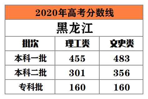 黑龍江 本科一批:理工類455分,文史類483分﹔本科二批:理工類301分,文史類356分。