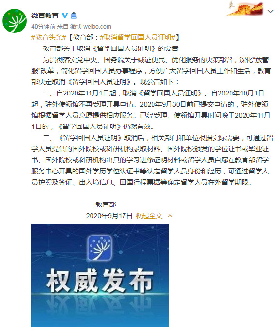 人民網(wǎng)北京9月17日電 (記者 郝孟佳)據(jù)教育部官方微博消息,為貫徹落實黨中央、國務(wù)院關(guān)於減証便民、優(yōu)化服務(wù)的決策部署,深化“放管服”改革,簡化留學(xué)回國人員辦事程序,方便廣大留學(xué)回國人員工作和生活,教育部決定取消《留學(xué)回國人員証明》。