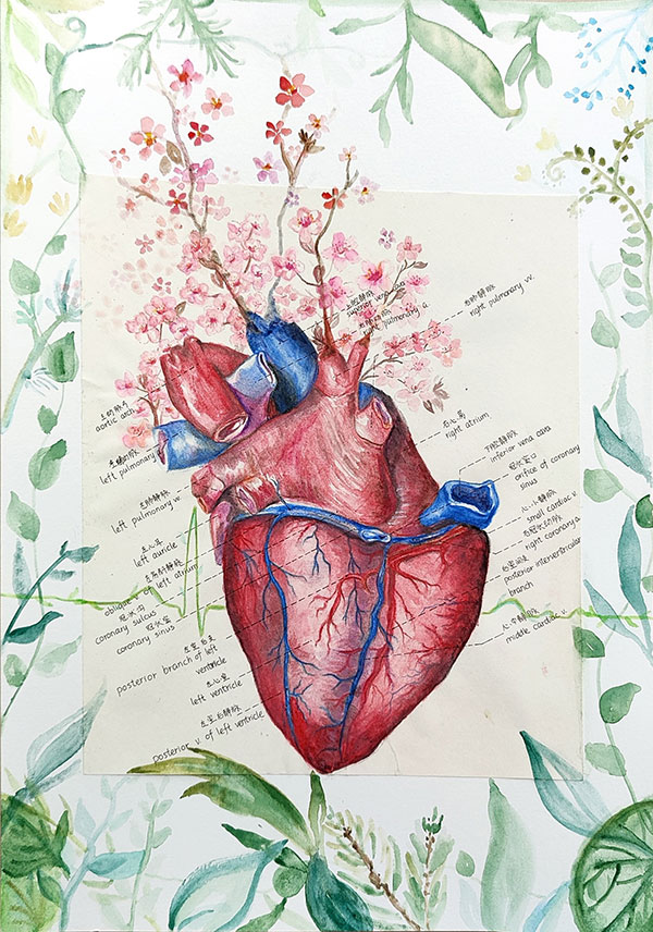 作者劉星廷解讀:作品以富有生命力的心臟借由科技與人類對話作為主題,選取心電圖和表面血管分布明顯的心臟后面觀,既突出心臟的血液充盈和立體感,又表現(xiàn)出一腔熱血、生機勃勃的涵義。畫作主要利用水溶性彩鉛、馬克筆和水彩,以寫實心臟為中心主體,上方伸展出紫葉李花束,背景為一周期正常的健康心電圖,圖畫上層為對實體心臟按比例放大繪圖后的標注。