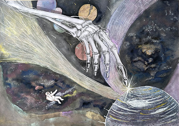 作者劉介清解讀:畫面主體為解剖學(xué)上的手骨與手部神經(jīng)部分。延伸的手骨代表著人類的渴望,神經(jīng)代表著每個人的內(nèi)在驅(qū)動和外在感知,而星辰代表著未來的光明與未知。作品表達人類在歷史發(fā)展過程中始終持有對知識的渴求、以及與未知事物的探索。