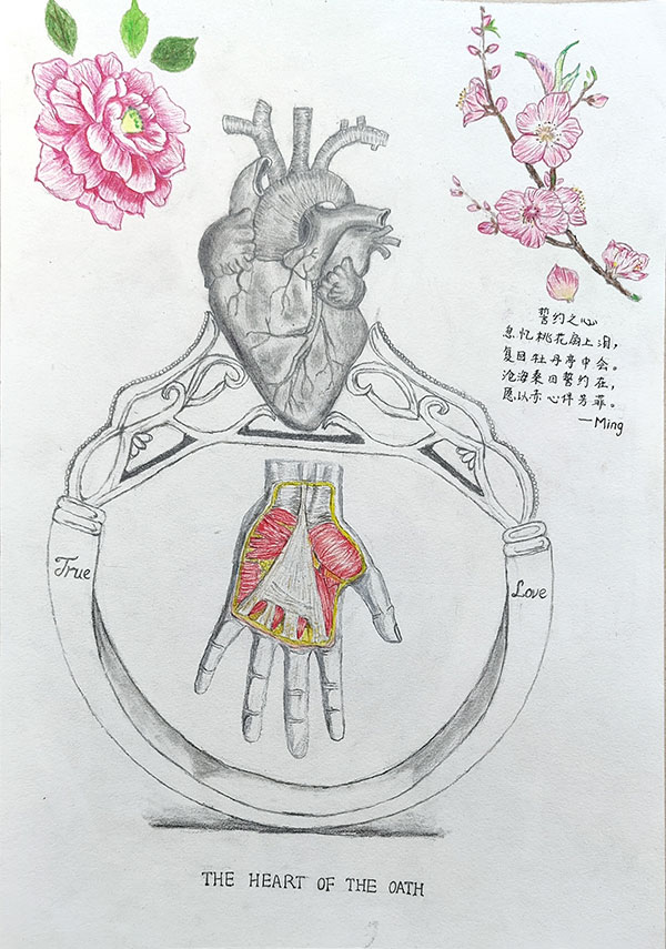 作者吳城箭解讀:誓約之戒,以心為鑽,為愛加冕。作品由心臟鑲嵌的戒指和一隻托舉的手構(gòu)成,象征著真心的托付﹔左右配以牡丹和桃花,寓意著牡丹亭和桃花扇兩個關(guān)於愛情的典故。作品中有英文、古詩、花朵和器官等元素存在,體現(xiàn)了醫(yī)學(xué)是一門以中西醫(yī)體系為主、發(fā)展歷史悠久的學(xué)科,也代表著醫(yī)學(xué)是自然科學(xué)、社會科學(xué)和人文科學(xué)的統(tǒng)一體。