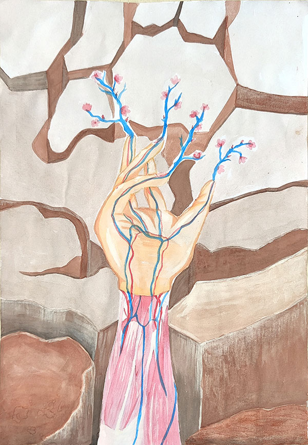 作者毛雨菲解讀:畫面中一片大地上,一隻筋肉強健的手緩緩?fù)信e起希望,靜脈和動脈交纏著從指尖開出一片海棠之花。這幅畫意味著天津大學(xué)首次設(shè)立醫(yī)學(xué)專業(yè),第一次綻放出了新醫(yī)科的花朵。這隻以靜脈動脈澆灌而成的海棠花將會在北洋學(xué)府的大地上以最熱烈的姿態(tài)向陽生長。