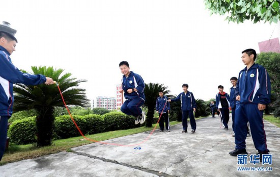 5月18日,湖南省資興市立中學(xué)的高三學(xué)生在玩跳繩游戲。