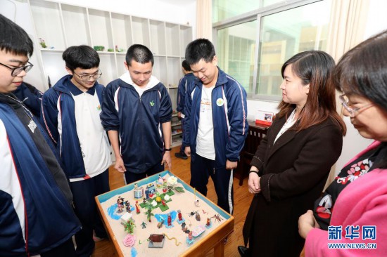 5月18日,在湖南省資興市立中學(xué)心理輔導(dǎo)室,心理老師袁芳荷(右二)帶領(lǐng)高三學(xué)生進(jìn)做沙盤(pán)游戲。