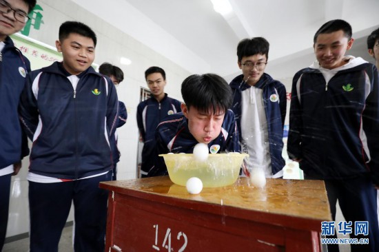 5月18日,湖南省資興市立中學(xué)的高三學(xué)生在進(jìn)行乒乓球趣味游戲。