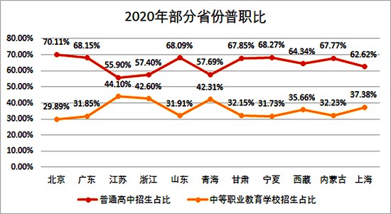 記者翻看了2020年各省《國(guó)民經(jīng)濟(jì)和社會(huì)發(fā)展統(tǒng)計(jì)公報(bào)》發(fā)現(xiàn),2020年北京市的普通高中招生佔(zhàn)比也是70%,而江蘇省普通高中招生佔(zhàn)比也達(dá)到了56%,而其他地區(qū)招生普職比大多在7︰3與5.6︰4.4之間。