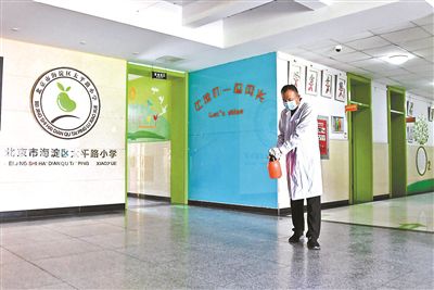 8月26日,在北京市海澱區(qū)太平路小學(xué),工作人員對(duì)教學(xué)樓樓道進(jìn)行消毒 供圖/新華社