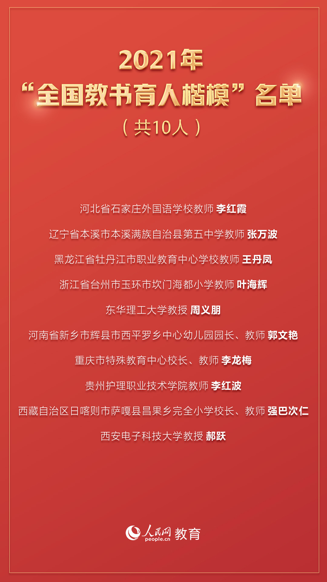 公示結(jié)束后,推選委員會(huì)組織召開推選會(huì),結(jié)合公示反饋情況,通過分組推選、大會(huì)評(píng)定、無記名投票等環(huán)節(jié),產(chǎn)生了10位全國教書育人楷模。他們是:河北省石家莊外國語學(xué)校教師李紅霞,遼寧省本溪市本溪滿族自治縣第五中學(xué)教師張萬波,黑龍江省牡丹江市職業(yè)教育中心學(xué)校教師王丹鳳,浙江省臺(tái)州市玉環(huán)市坎門海都小學(xué)教師葉海輝,東華理工大學(xué)教授周義朋,河南省新鄉(xiāng)市輝縣市西平羅鄉(xiāng)中心幼兒園園長、教師郭文艷,重慶市特殊教育中心校長、教師李龍梅,貴州護(hù)理職業(yè)技術(shù)學(xué)院教師李紅波,西藏自治區(qū)日喀則市薩嘎縣昌果鄉(xiāng)完全小學(xué)校長、教師強(qiáng)巴次仁,西安電子科技大學(xué)教授郝躍。