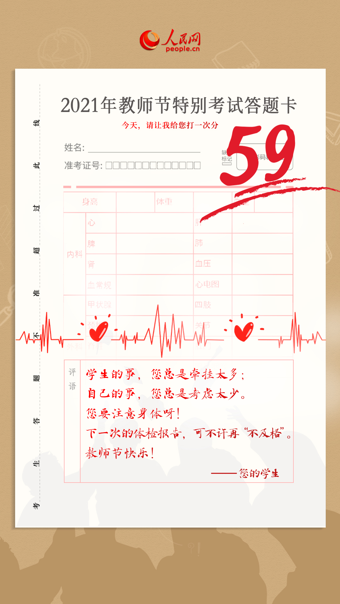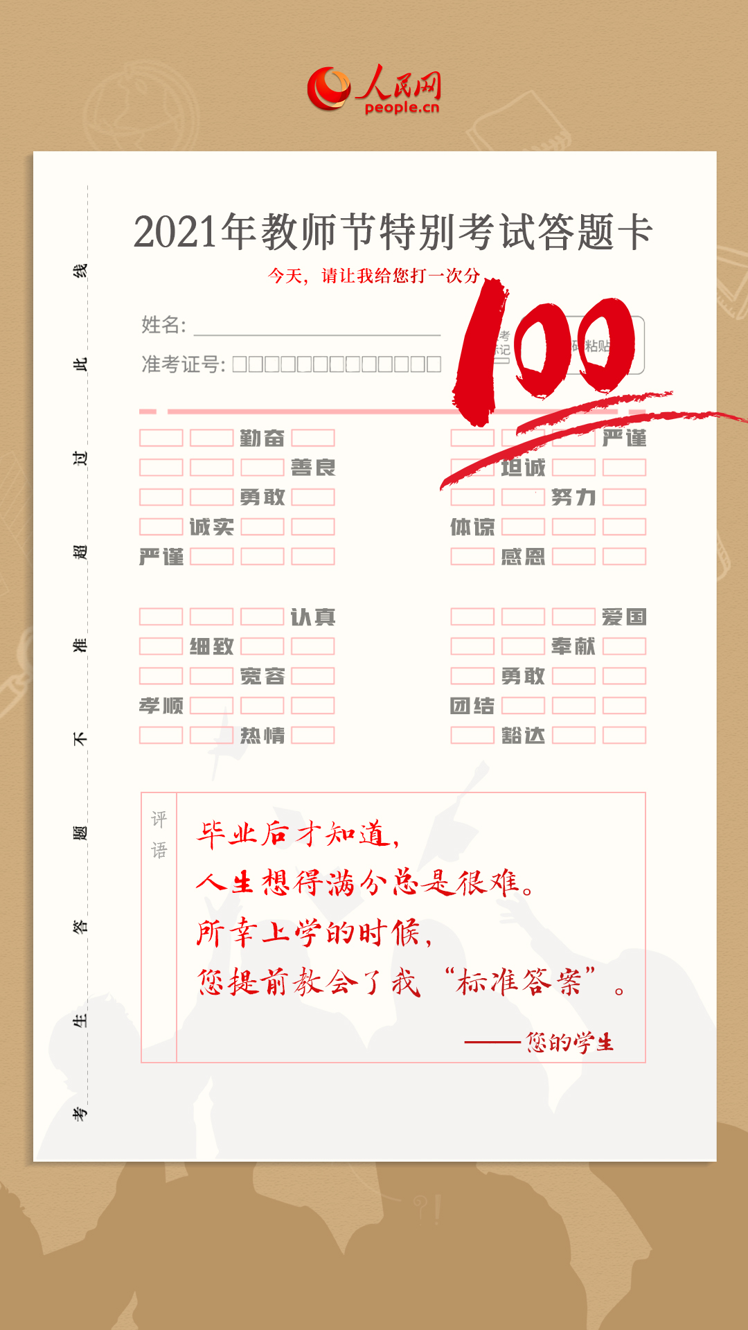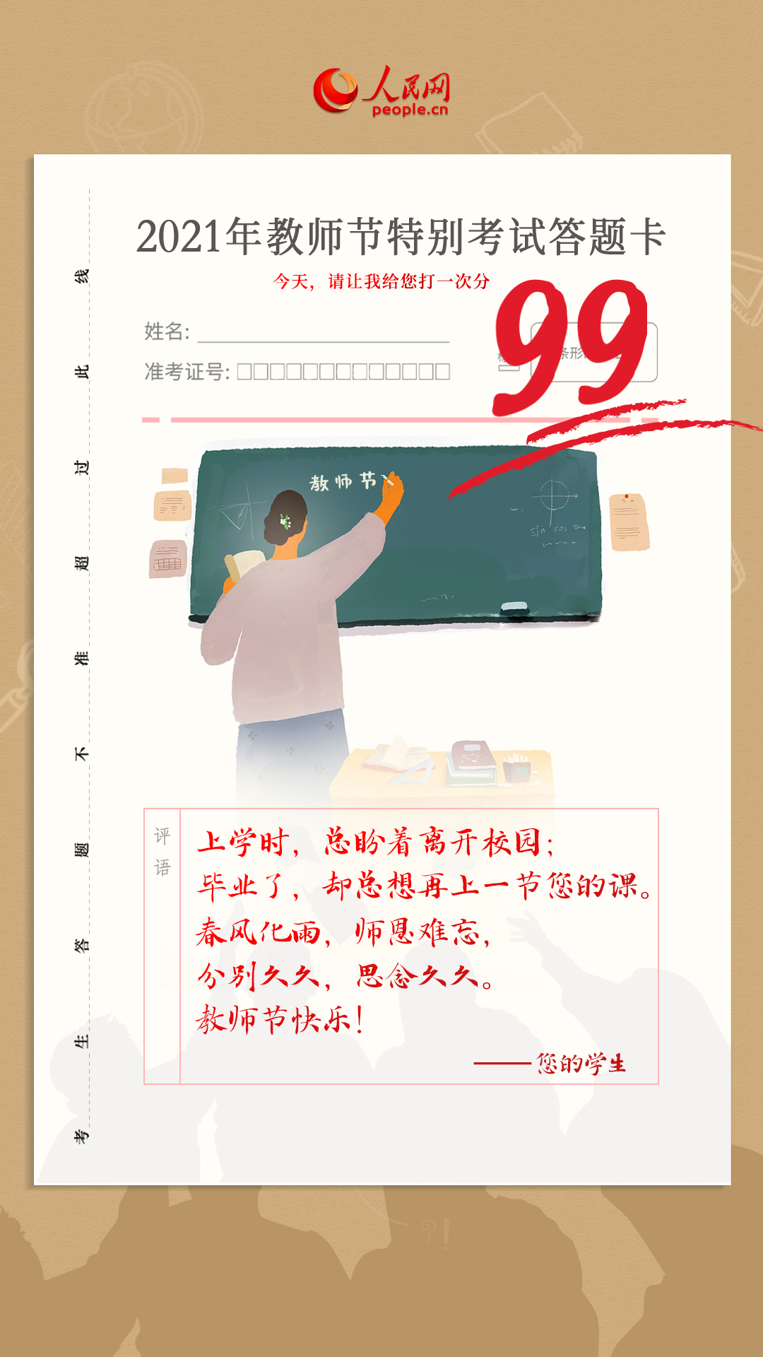 上學(xué)時(shí),總盼著離開(kāi)校園﹔畢業(yè)了,卻總想再上一節(jié)您的課。春風(fēng)化雨,師恩難忘﹔分別久久,思念久久。今天,讓我們用特別的考試答題卡,一起為青春時(shí)間的老師打一次分,祝願(yuàn)老師節(jié)日快樂(lè)!