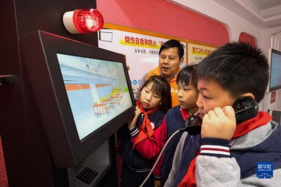 11月8日,在浙江省湖州市長興縣實驗小學消防館內(nèi),學生們體驗消防報警流程。