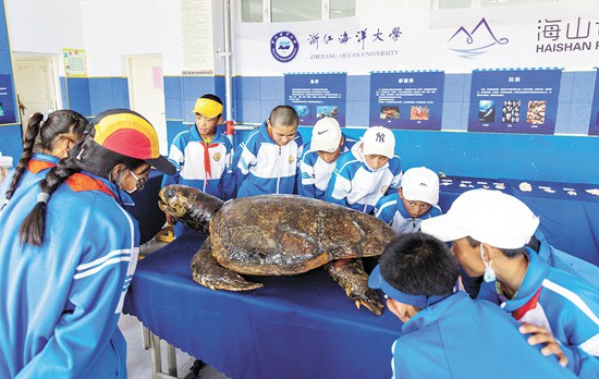 路氏雙髻鯊、蠵龜、虎斑寶貝……支教隊10位隊員把打包好的百余件海洋生物標本帶到了青海。這些在課本上都沒見過的海洋生物,讓當?shù)睾⒆觽兣膊婚_眼?!斑@個貝殼是真的嗎?”“它們都是生活在大海裡嗎?”好奇的聲音纏得支教隊的小老師們來不及作答。