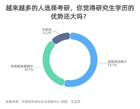 越來越多的人選擇考研,53.7%的受訪者覺得研究生學(xué)歷的優(yōu)勢依舊很大,34.1%的受訪者覺得優(yōu)勢越來越縮水,12.2%的受訪者表示不好說。