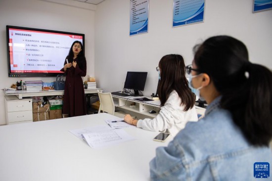 4月14日,在湖南長沙中南大學就業(yè)指導中心,老師(左一)為學生進行面試指導。