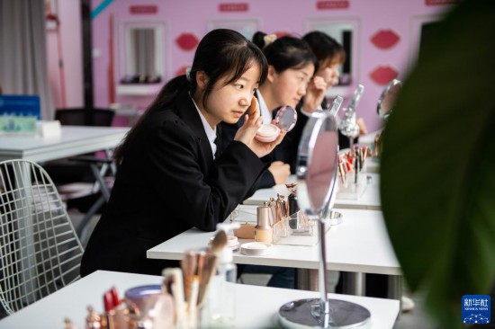 4月14日,在湖南長沙中南大學就業(yè)指導中心,學生在面試前化妝。